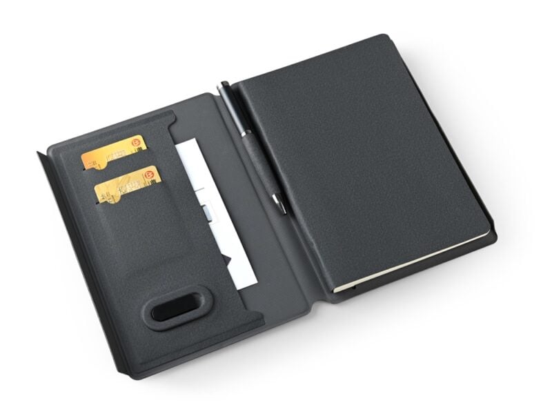 POWER NOTE – 5W Wireless Charging Notebook with 5000mAh Powerbank, Foldable Stand & Lycra Pockets